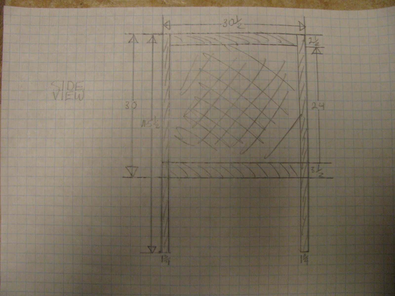 This is a sketch of what the front of the crib will look like with a few dimensions. The sketch does not show well so I will talk more about it in my next post. The crib appears to be square which is not how I drew it. The crib will measure 53 inches long by 30 inches wide. It is more of a rectangle than a square.
